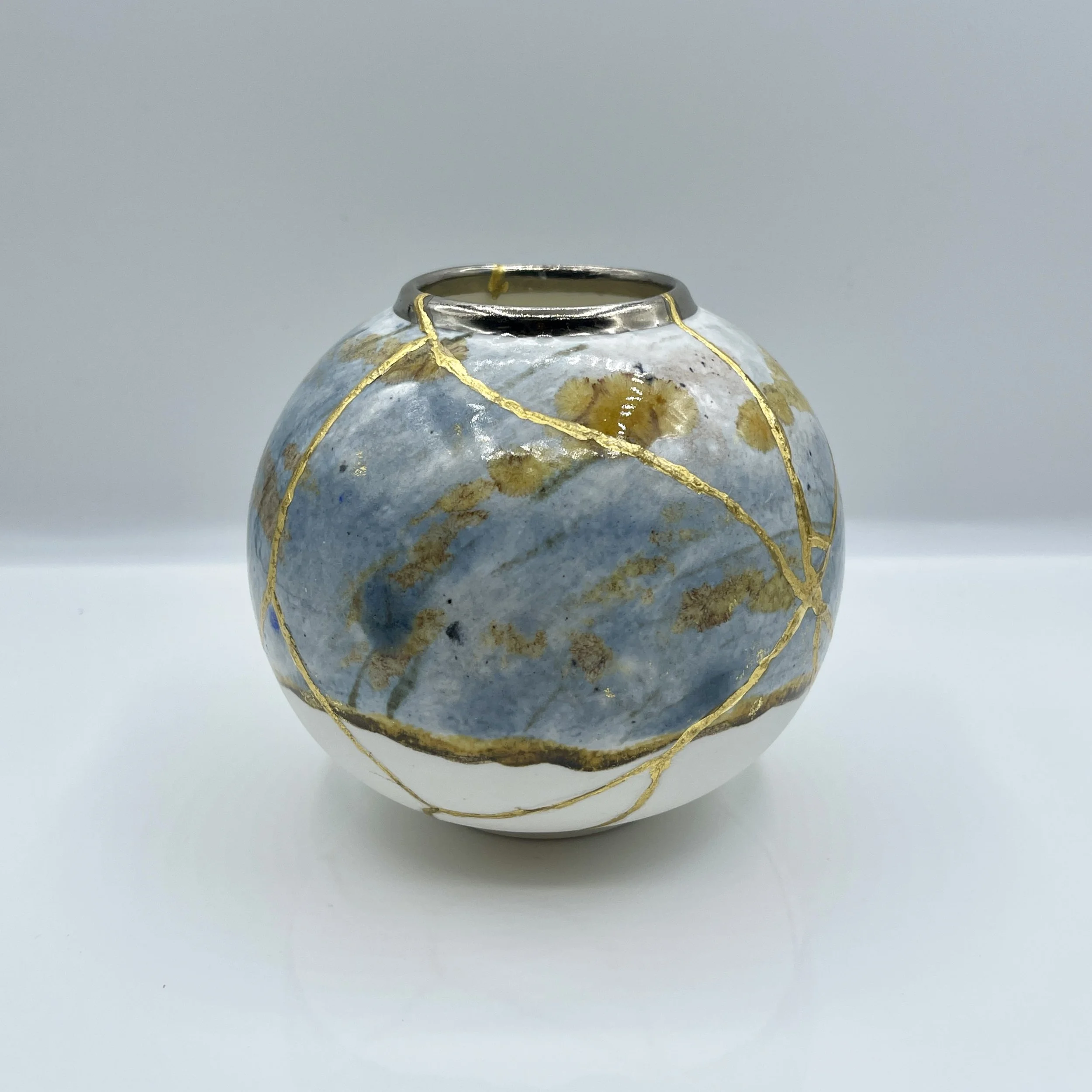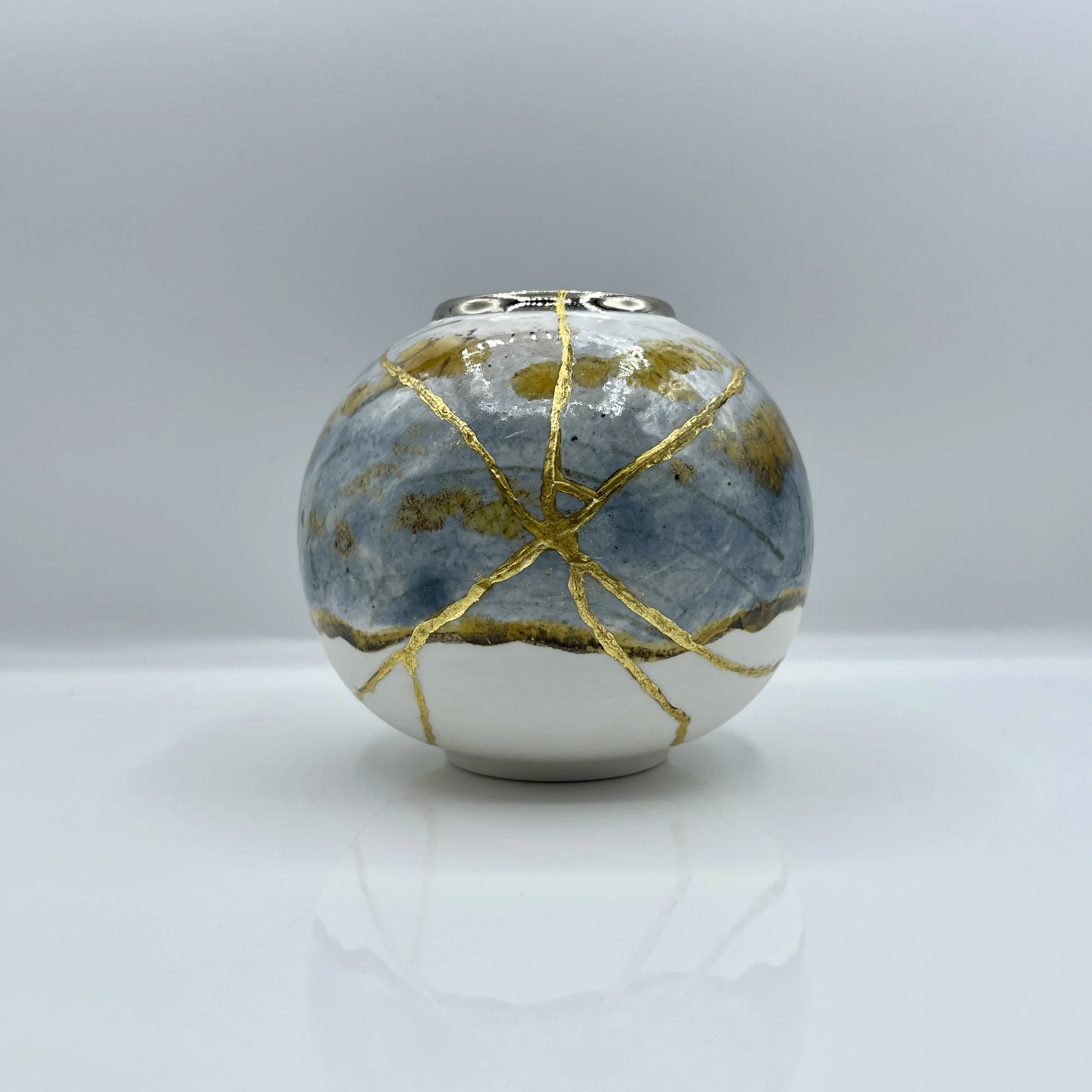 PLEASE NOTE: This piece is a globe that has cracked during firing and intentionally repaired using the style of Kintsugi highlighting the repairs in gold leaf.