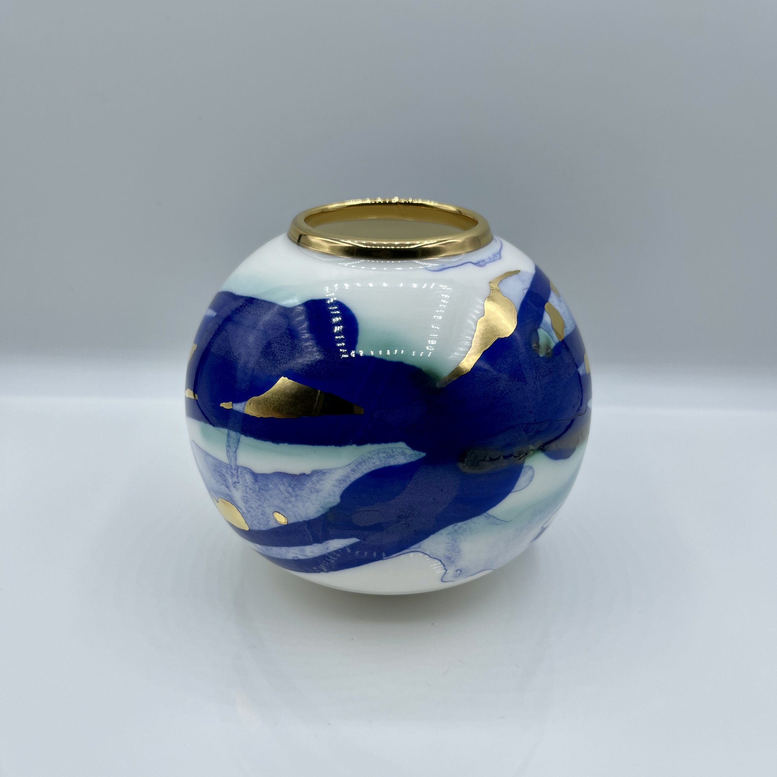 This piece is finished with a cobalt blue, and copper green wash creating a beautiful flowing movement around the globe. The globe has gold detailing on the body and rim resulting in a beautiful reflective and abstract design across the translucent fine bone china globe.