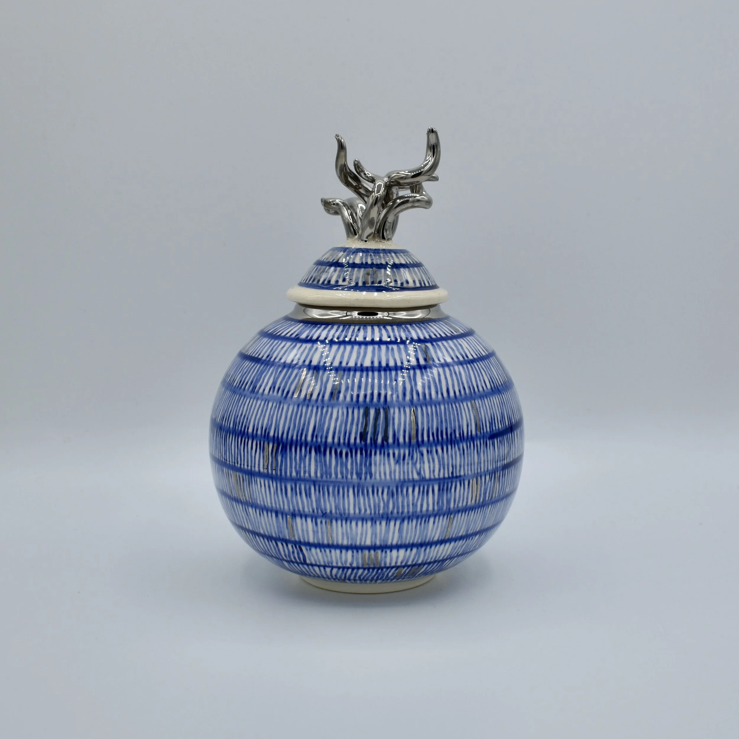 With a library effect of blue panelling achieved using a fine Japanese brush this Sea Urn has been finished with platinum detailing on the body of the globe, the rim and the fronds on the lid.