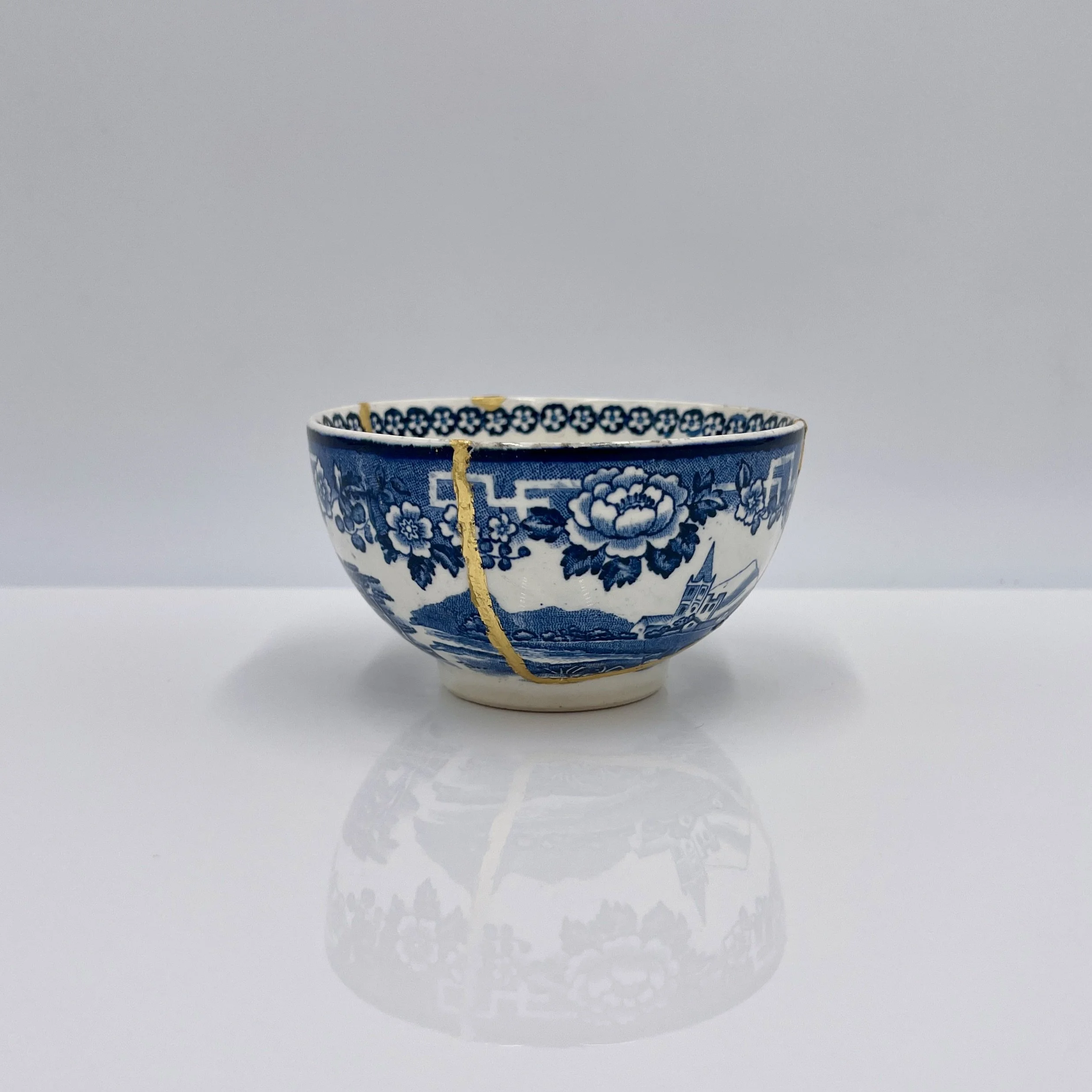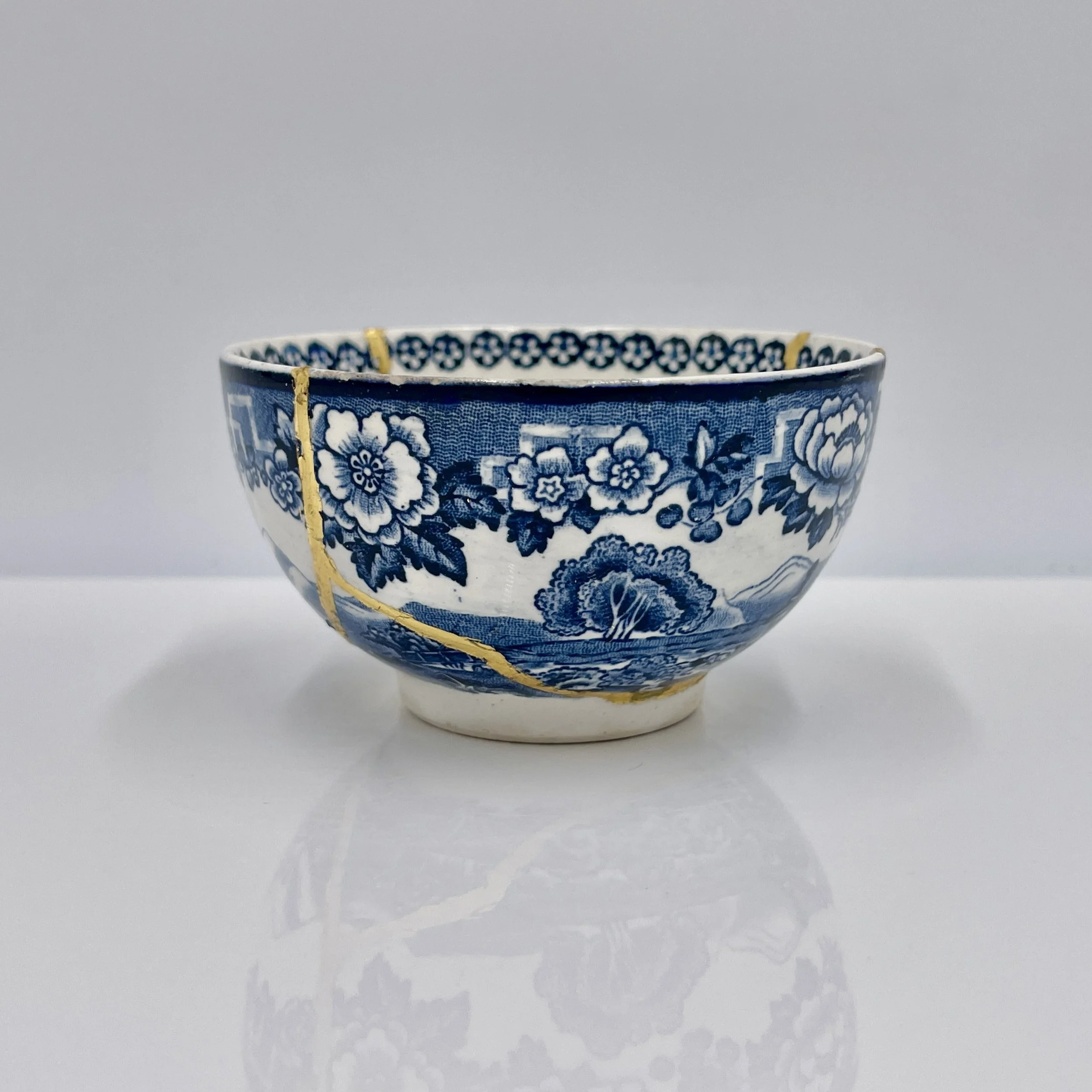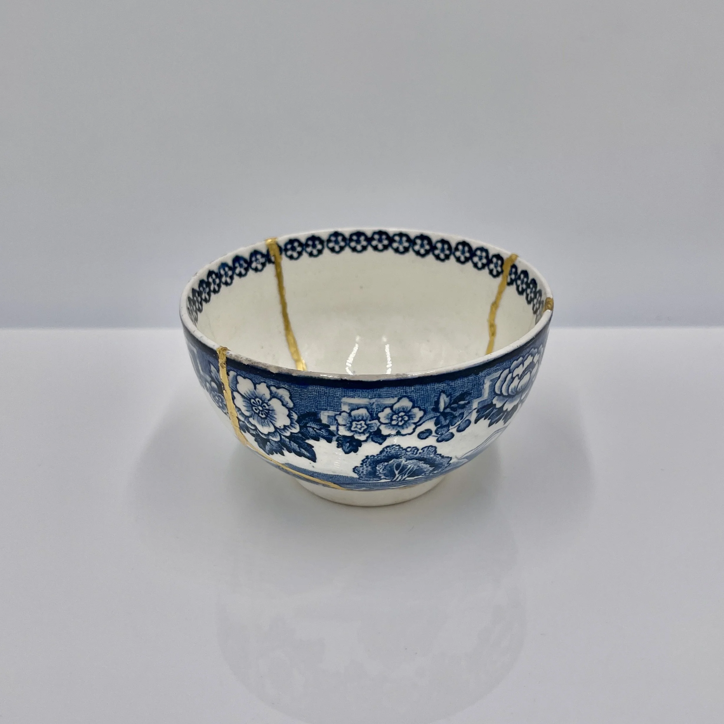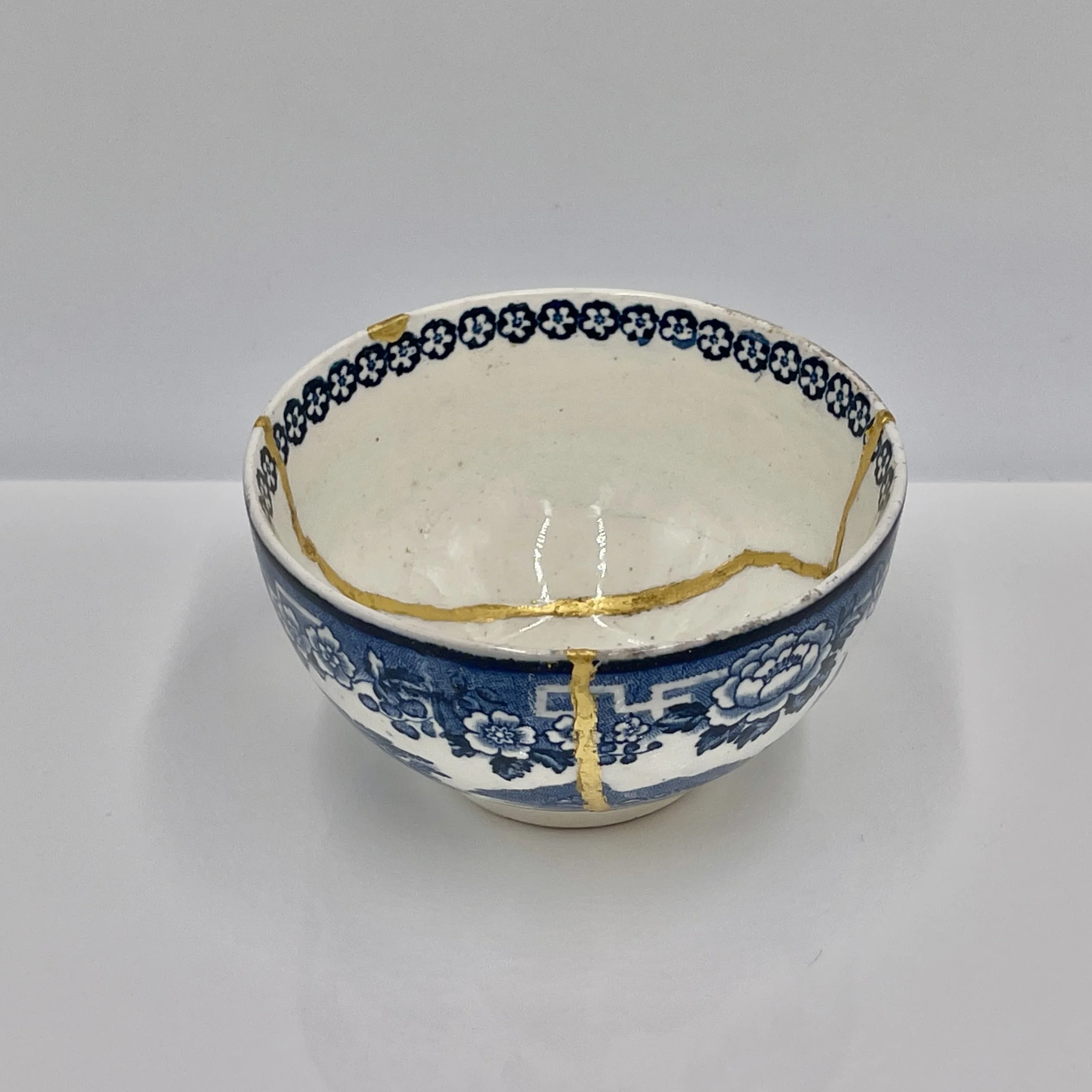 The piece has been finished with gold detailing on the rim and gold leaf highlighting the repairs in the style of Kintsugi on the external parts of the globe, whilst internally the damage is visible without being highlighted.
